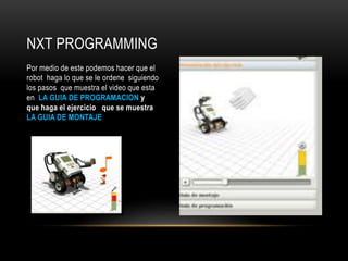 Este documento presenta varios ejercicios de programación para un robot NXT Mindstorms. Incluye instrucciones para controlar la velocidad del robot mediante sonidos, hacer que el robot reaccione a la distancia y la luz, y moverse según indicaciones acústicas. También cubre hacer que el robot se desplace a una distancia fija de un objeto que se mueve.