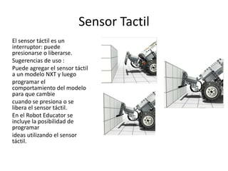 El documento habla sobre el sensor táctil del LEGO Mindstorms NXT. Explica que el sensor táctil funciona como un interruptor que puede presionarse o liberarse, y que se puede agregar a un modelo NXT para programar su comportamiento de modo que cambie cuando se presione o libere el sensor. También menciona que el Robot Educator permite programar ideas utilizando el sensor táctil.