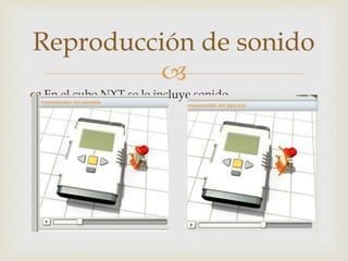 El documento describe 4 pasos para configurar un cubo NXT: 1) incluir sonido reproducción, 2) configurar una imagen en la pantalla, 3) programarlo para retroceder, y 4) programarlo para acelerar. Proporciona un resumen breve de las acciones realizadas en cada paso para configurar el cubo NXT.