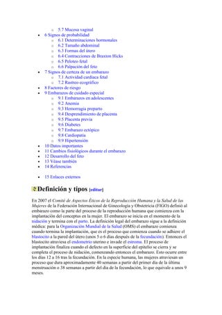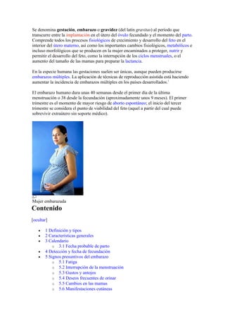 El documento describe los diferentes aspectos de la gestación humana. Define la gestación como el período entre la implantación del óvulo fecundado en el útero hasta el parto. Explica que dura unas 40 semanas y se divide en tres trimestres. Detalla los cambios fisiológicos que ocurren en la mujer embarazada y el desarrollo del feto a lo largo de la gestación.