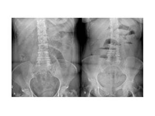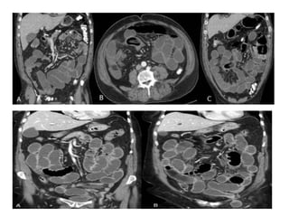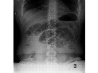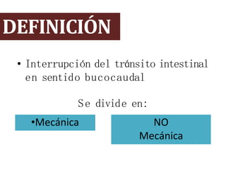La obstrucción intestinal causa interrupción del tránsito intestinal en sentido bucocaudal y puede ser mecánica u no mecánica. Los síntomas principales son dolor abdominal, distensión y vómito. El diagnóstico se confirma mediante estudios radiológicos como serie abdominal y tomografía computarizada que muestran dilatación proximal e intestino delgado y ausencia de aire distal.