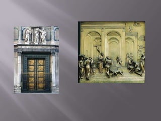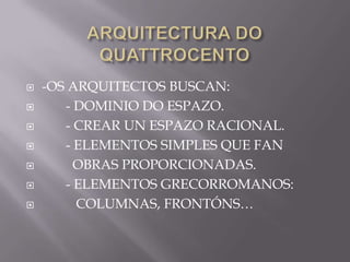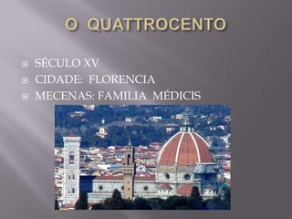El documento describe la arquitectura y las obras de arte del siglo XV en Florencia, Italia, durante el mecenazgo de la familia Médici. Los arquitectos buscaban dominar el espacio de una manera racional y proporcionada usando elementos clásicos griegos y romanos como columnas y frontones. Algunas de las obras más destacadas mencionadas son la cúpula de la catedral de Florencia de Filippo Brunelleschi, las iglesias de San Lorenzo y Santa Maria Novella, y las esculturas de Donatello como San