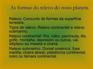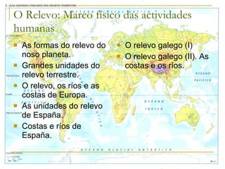 Este documento describe las características generales del relieve terrestre y las principales unidades de relieve de Europa y España. Explica que el relieve está formado por el conjunto de formas de la superficie terrestre, incluyendo continentes, océanos, mares, montañas, mesetas, depresiones, ríos y costas. Luego describe las características del relieve de cada continente, las penínsulas, islas, cadenas montañosas y otros accidentes geográficos de Europa. Finalmente, analiza las unidades de relieve de España, incluyendo