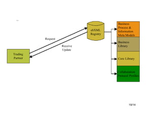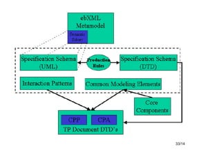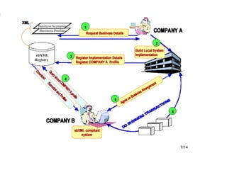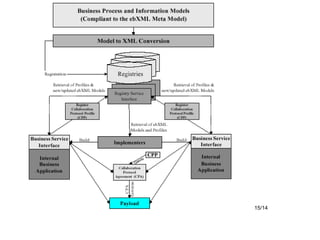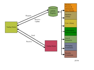 El documento proporciona una introducción a la arquitectura técnica ebXML, incluyendo sus objetivos de diseño, visión general, metodología de modelado, fases funcionales e infraestructura. ebXML busca estandarizar los procesos de negocio y el intercambio de información entre empresas a través de la descripción de procesos, el registro de metadatos y la mensajería electrónica.