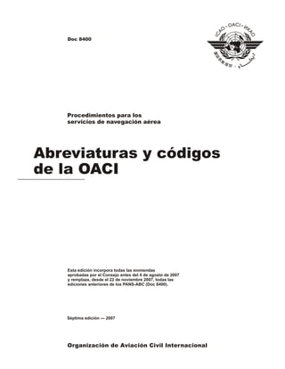 Este documento proporciona abreviaturas, códigos y fraseología estandarizada para su uso en comunicaciones aeronáuticas internacionales y documentos de información aeronáutica. Incluye abreviaturas, términos transmitidos como palabras habladas y en forma no fonética, designación de emisiones de radio, códigos para notificar la calidad de señales, y el código NOTAM. El Consejo de la OACI aprobó estos estándares para promover la comprensión mutua en las operaciones aeronáutic