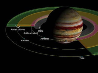 Júpiter es el planeta más grande del sistema solar. Está compuesto principalmente de hidrógeno y helio, y genera un fuerte campo magnético. Tiene 79 satélites naturales, incluyendo los 4 grandes (Ío, Europa, Ganímedes y Calisto) descubiertos por Galileo. También tiene un delgado sistema de anillos compuesto por partículas de polvo eyectadas de las lunas interiores.