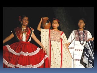 El documento presenta información sobre el estado mexicano de Oaxaca. Resalta su gran diversidad cultural y lingüística, con más de 16 grupos étnicos. Describe brevemente sus 8 regiones geográficas, que albergan una amplia variedad de paisajes, desde montañas hasta playas. También destaca algunos de sus principales sitios arqueológicos, naturales y culturales, así como aspectos de la gastronomía y artesanía local.
