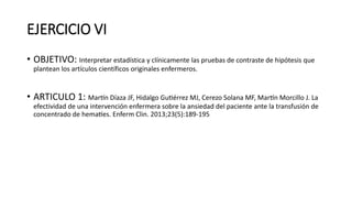 Este documento presenta las tareas de un ejercicio sobre la interpretación estadística y clínica de pruebas de contraste de hipótesis en artículos científicos enfermeros. Se analiza un artículo que estudia la efectividad de una intervención enfermera para reducir la ansiedad de pacientes ante una transfusión. Se identifican las variables sometidas a pruebas t de Student y se formulan las hipótesis nula y alternativa sobre los niveles de ansiedad antes y después de la intervención. Los resultados muestran que los n