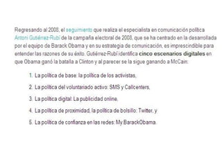 El documento describe las estrategias digitales y de redes sociales exitosas utilizadas en la campaña presidencial de Barack Obama en 2008. Obama superó a sus oponentes en el uso de sitios como Facebook, YouTube y Twitter para involucrar a voluntarios, recaudar fondos y difundir su mensaje. Recibió apoyo de grupos activistas online y logró una participación sin precedentes a través de la organización de eventos, llamadas y mensajes de texto.