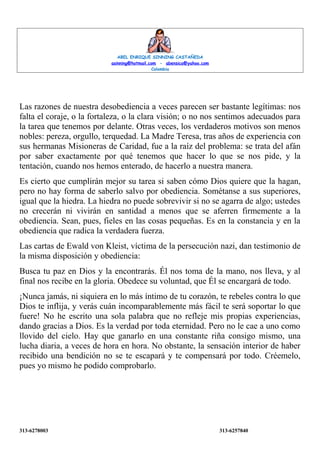 La obediencia es un desafío para la mayoría de las personas. El documento discute cómo el orgullo y el individualismo modernos dificultan la obediencia a Dios y a las autoridades. Además, enfatiza que la verdadera fuerza y paz provienen de someter voluntariamente la propia voluntad a Dios a través de la obediencia, no de seguir los propios deseos. Finalmente, cita a la Madre Teresa y a Ewald von Kleist para ilustrar cómo la obediencia trae consigo una bendición interior a pesar de los