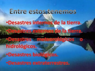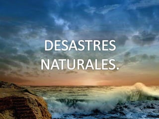 Los desastres naturales son cambios que ocurren naturalmente en la Tierra y pueden afectar a los seres humanos. Aunque son fenómenos naturales, la acción humana como la ocupación inadecuada del territorio puede contribuir a los daños. Algunos desastres mencionados son terremotos, erupciones volcánicas, deslaves, derrumbes e inundaciones.
