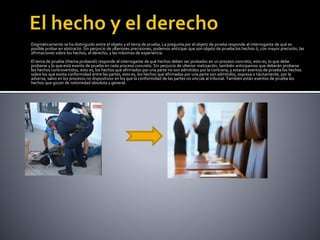 El documento distingue entre el objeto y el tema de prueba. El objeto de prueba se refiere a qué puede probarse en abstracto, como hechos, afirmaciones sobre hechos y derecho. El tema de prueba se refiere a qué debe probarse específicamente en un caso, como los hechos controvertidos. Los hechos sobre los que exista conformidad entre las partes no requieren prueba. Las fuentes de prueba son los hechos, objetos o circunstancias que se tratan de probar, aunque no siempre