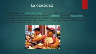 Este documento resume la obesidad, sus causas y consecuencias. La obesidad se define como una acumulación excesiva de grasa corporal que pone en riesgo la salud. Sus principales causas son una dieta hipercalórica rica en grasas y azúcares con falta de actividad física, así como factores genéticos. Las consecuencias incluyen un mayor riesgo de enfermedades cardíacas, diabetes, cánceres y problemas óseos y articulares. La prevención requiere educación alimentaria y un equ