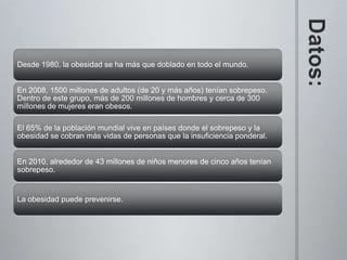 El documento describe el aumento mundial de la obesidad desde 1980, con más de 1500 millones de adultos con sobrepeso en 2008. La obesidad se define como una acumulación excesiva de grasa que puede ser perjudicial para la salud, y se mide utilizando el índice de masa corporal. Las causas fundamentales son un desequilibrio entre calorías consumidas y gastadas, y los efectos incluyen enfermedades cardiovasculares, diabetes y cáncer. A nivel individual, se recomienda limitar la ingesta de grasas y azúca