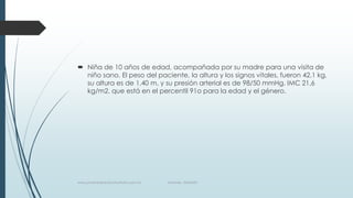 El documento presenta el caso de una niña de 10 años con un IMC de 21.6 kg/m2, que se encuentra en el percentil 91 para su edad y género. Se discuten los factores de riesgo para sobrepeso y obesidad como antecedentes familiares y tiempo frente a la televisión. La comorbilidad más frecuente es la diabetes mellitus. El tratamiento más adecuado incluye dieta, ejercicio y cambios en el estilo de vida.