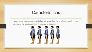 La obesidad es una enfermedad crónica causada por un exceso de grasa corporal que se produce por malos hábitos alimenticios y falta de ejercicio, así como factores genéticos, socioeconómicos y psicológicos. Los síntomas incluyen dificultad para respirar y problemas ortopédicos. Se clasifica en obesidad central y periférica, y existen tratamientos como dietas, ejercicio, terapia psicológica y en casos graves, cirugía. La obesidad es actualmente un problema de