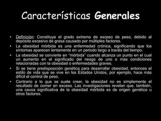 La obesidad mórbida se define como un exceso extremo de peso causado por un depósito excesivo de grasa. Puede causar numerosas enfermedades como diabetes, hipertensión y problemas cardíacos. Sus causas incluyen factores genéticos, metabólicos y de estilo de vida como una dieta poco saludable y falta de ejercicio. El tratamiento implica cambios en la alimentación, hábitos de vida y en algunos casos medicamentos o cirugía. Representa un serio problema de salud pública.