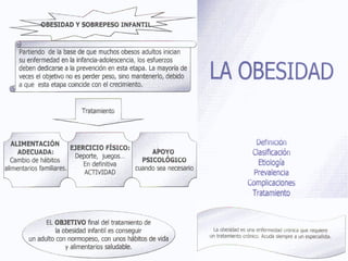 La obesidad es una enfermedad crónica clasificada según el índice de masa corporal y causada por factores hereditarios, de estilo de vida sedentario y alta ingesta calórica. Puede causar complicaciones como diabetes, enfermedades cardiovasculares y cáncer. Su tratamiento implica un cambio permanente en el estilo de vida a través de dieta equilibrada, ejercicio regular y terapia psicológica.