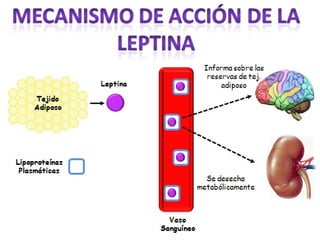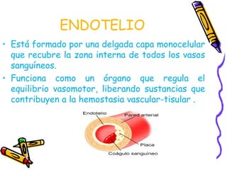 El documento describe la obesidad y el endotelio. El endotelio es una capa monocelular que recubre los vasos sanguíneos y regula la homeostasis vascular. En la obesidad, el tejido adiposo secreta hormonas como la adiponectina y la leptina que afectan la función endotelial. La obesidad también causa inflamación crónica y estrés oxidativo que dañan el endotelio.