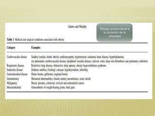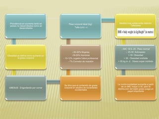 Este documento describe los desafíos médicos asociados con la anestesia en pacientes obesos. Explica que la obesidad está aumentando a nivel mundial y define la obesidad como un exceso de grasa corporal. Luego discute los riesgos para los sistemas respiratorio y cardiovascular, así como las consideraciones para la evaluación de la vía aérea, monitorización y dosificación de medicamentos. Finalmente, enfatiza la importancia de un enfoque multimodal para el manejo anestésico de pacientes obesos.