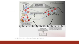 Este documento habla sobre la obesidad. Define la obesidad como una acumulación excesiva de grasa corporal que puede ser perjudicial para la salud y se mide mediante el IMC. Explica que la obesidad es una enfermedad multifactorial que involucra factores genéticos, ambientales y de estilo de vida. También describe las complicaciones médicas relacionadas con la obesidad y las estrategias conductuales, cognitivas y de terapia que se utilizan en el tratamiento de la obesidad.