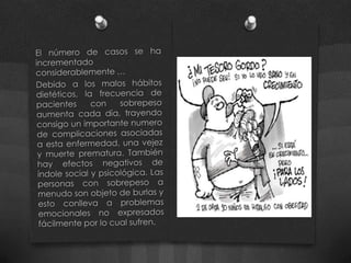 La obesidad es una enfermedad global que afecta a personas de todas las edades y géneros, generando graves consecuencias de salud física y emocional. Su prevalencia ha aumentado debido a factores como la genética, el estilo de vida sedentario y la alimentación poco saludable, convirtiéndose en una de las principales causas de mortalidad en países como México y Estados Unidos. Es crucial crear conciencia sobre esta enfermedad y promover hábitos saludables para prevenir y controlar la obesidad.