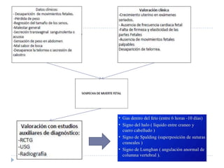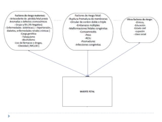 Este documento describe la definición y factores de riesgo del óbito fetal. Define el óbito fetal como la muerte del feto antes de la expulsión, a partir de la semana 22 de gestación o con un peso mayor a 500 gramos. Detalla factores de riesgo maternos como la edad, enfermedades sistémicas, tabaquismo y obesidad. También menciona factores fetales como el sexo masculino, malformaciones congénitas y peso. Explica que el diagnóstico se basa en la ausencia de movimientos fetales,