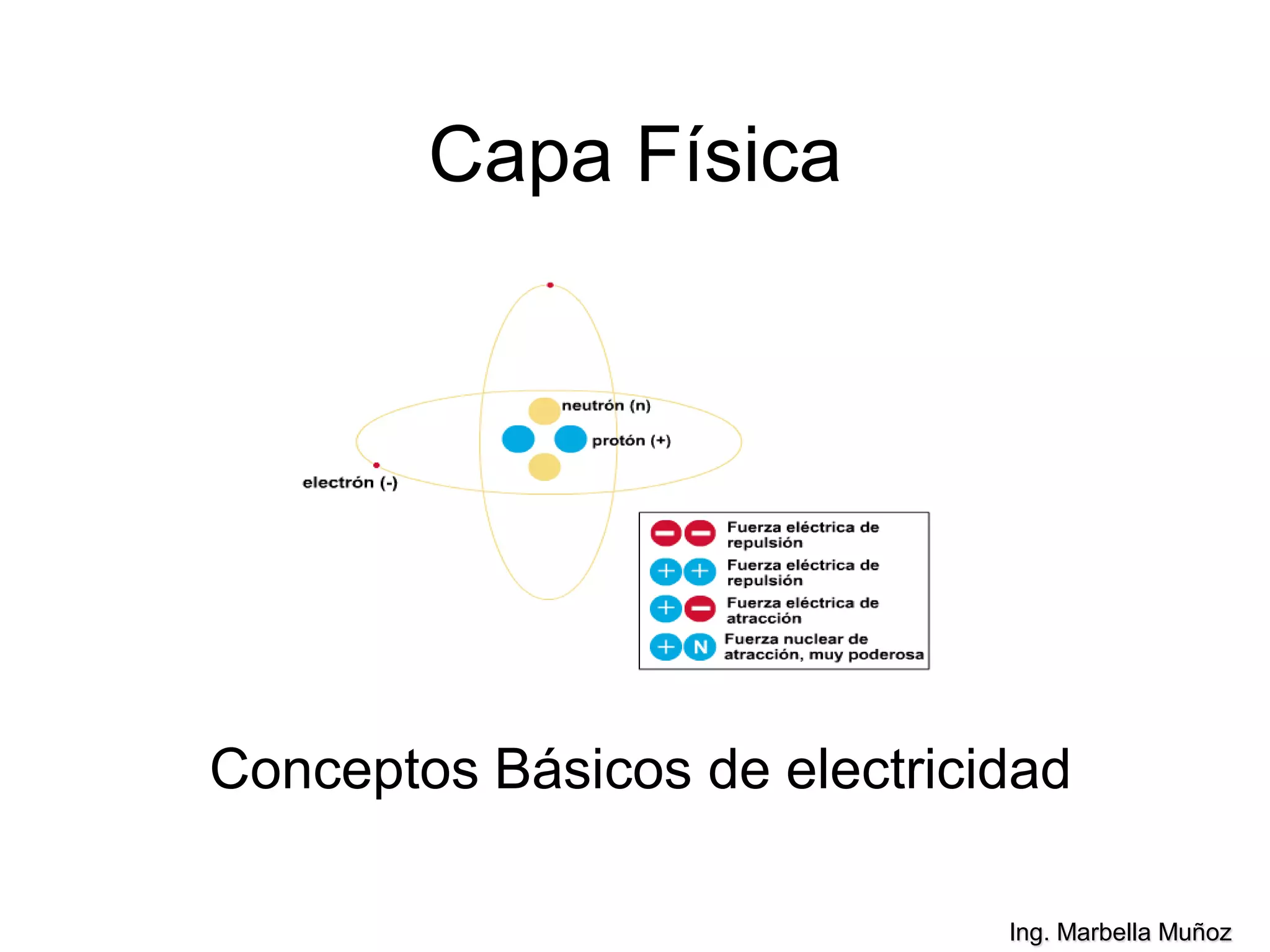 Este documento presenta conceptos básicos de electricidad y características de la capa física en redes de computadoras. Explica que la capa física define las especificaciones eléctricas, mecánicas y funcionales para la transmisión de datos a través de medios como cables y satélites. También describe conceptos como conductores, aislantes, semiconductores, voltaje, corriente, resistencia y cómo estos permiten el flujo de electricidad en los circuitos de las redes.