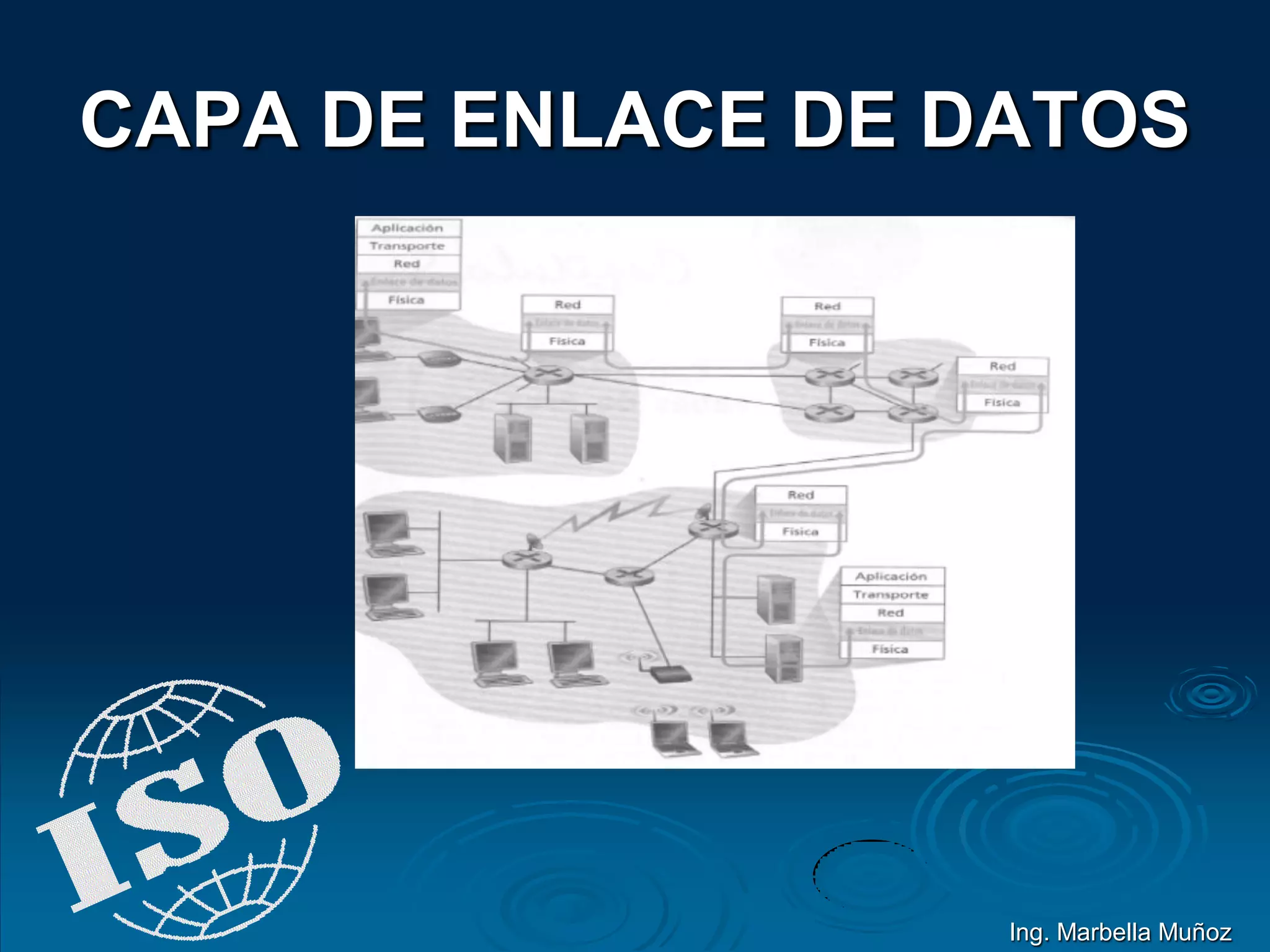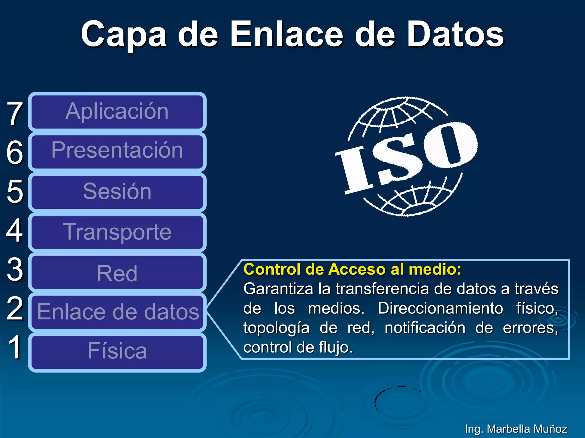 La capa de enlace de datos proporciona un enlace lógico confiable entre dos máquinas a través de un enlace físico mediante el direccionamiento físico, la topología de red, la notificación de errores y el control de flujo. Se divide en las subcapas MAC y LLC. Los principales estándares son IEEE 802 (Ethernet), 802.3, 802.5 (Token Ring) y 802.2 (control de enlace lógico).