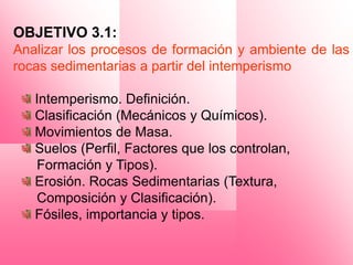 Este documento trata sobre los procesos exógenos como la meteorización, la formación de suelos y rocas sedimentarias. Explica que la meteorización incluye procesos físicos y químicos que desintegran las rocas. Luego, los movimientos de masa transportan este material que eventualmente se deposita y consolida para formar rocas sedimentarias, mientras que en la superficie se forma el suelo.
