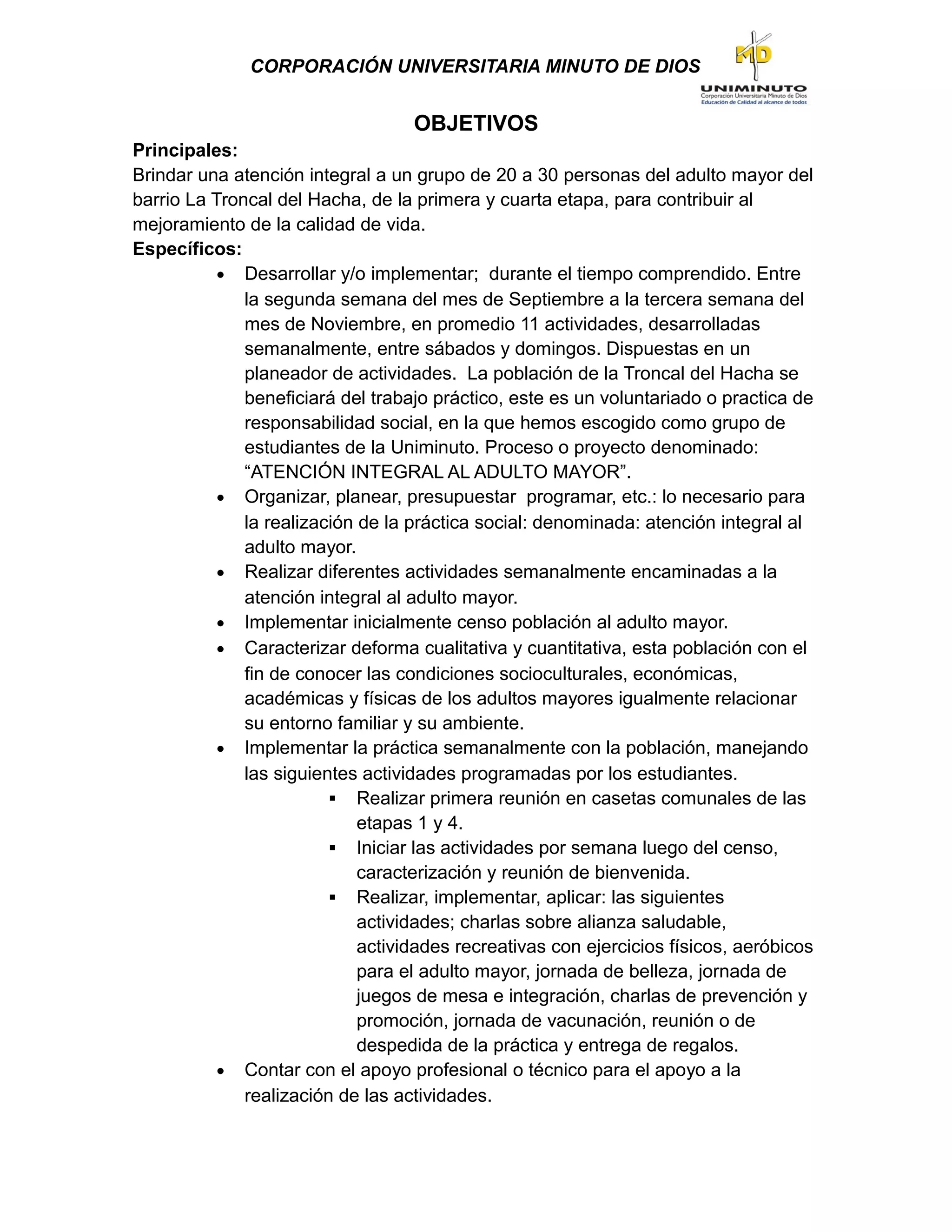 La Corporación Universitaria Minuto de Dios tiene como objetivo brindar atención integral a 20 a 30 adultos mayores del barrio La Troncal del Hacha, mejorando su calidad de vida a través de un voluntariado que se llevará a cabo desde septiembre hasta noviembre. El proyecto incluirá un censo y caracterización de la población, seguido de 11 actividades semanales como charlas, ejercicios físicos, y jornadas de belleza e integración. Se busca también contar con apoyo profesional para garantizar la efectividad de las iniciativas.
