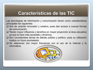 Este documento describe las características, objetivos, ventajas y desventajas de las tecnologías de la información y la comunicación (TIC). Las TIC se caracterizan por ser innovadoras, mejorar la educación y estar relacionadas con Internet. Sus objetivos incluyen permitir el aprendizaje interactivo y a distancia y ofrecer nuevas formas de trabajo. Entre sus ventajas se encuentran el aprendizaje interactivo y la educación a distancia, mientras que entre sus desventajas están la falta de privacidad y el aislamiento.