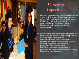 La universidad busca formar profesionales capaces de enfrentar los retos de un mundo cambiante a través del avance del conocimiento y la tecnología. También busca formar recursos humanos de acuerdo con una política social que promueva el desarrollo y bienestar de aquellos sin acceso a oportunidades, así como promover una estrategia de modernización a través de programas de educación social, rehabilitación, prevención y bienestar socio-laboral.