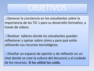 El documento describe objetivos para incluir las TIC's en la vida escolar de estudiantes de octavo grado. Los objetivos incluyen generar conciencia sobre la importancia de las TIC's a través de videos y talleres, diseñar un espacio de chat para fomentar el cuidado de recursos tecnológicos, y desarrollar estrategias de manejo de información y comunicación a través de la creación de un blog y edición de sonido y video para promover el cuidado de la institución.
