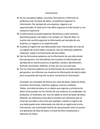 Este documento describe los objetivos y conceptos clave de una base de datos creada en Microsoft Access. Los objetivos incluyen aprender sobre tablas, relaciones, formularios e informes para organizar y presentar datos de una empresa. Las tablas almacenan los datos de forma organizada, las relaciones vinculan datos entre tablas, los formularios permiten ver y editar datos, e informes generan reportes de los datos.