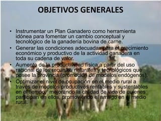 OBJETIVOS GENERALES • Instrumentarun Plan Ganadero como herramienta idónea para fomentar un cambio conceptual y tecnológico de la ganadería bovina de carne. • Generar las condiciones adecuadas para el crecimiento económico y productivo de la actividad ganadera en toda su cadena de valor. • Aumento de la productividad física a partir del uso racional de los recursos naturales y tecnológicos que posee la provincia (promoción de modelos endógenos). • Optimizar el nivel de ocupación en el medio rural a través de modelos productivos rentables y sustentables en el tiempo, mejorando la calidad de vida de quienes participan en ellos, promoviendo el arraigo en el medio rural.