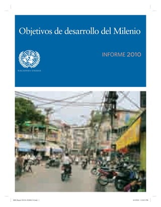 Este documento presenta el informe de 2010 de las Naciones Unidas sobre los Objetivos de Desarrollo del Milenio. El informe evalúa los progresos realizados hacia los ocho objetivos establecidos en el año 2000 para erradicar la pobreza y mejorar las vidas de las personas en todo el mundo. El informe concluye que se han logrado avances significativos en áreas como la reducción de la pobreza, la educación y la salud infantil, pero que los progresos han sido irregulares y se necesitan mayores esfuerzos para