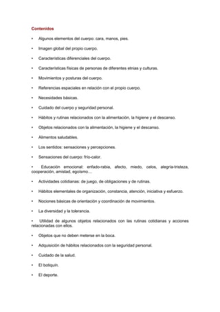 El documento describe los objetivos y contenidos de un programa educativo para niños pequeños enfocado en el desarrollo de su autoconocimiento, habilidades motrices, emociones, cuidado personal e interacción con los demás. Los objetivos incluyen el desarrollo de la percepción del propio cuerpo, la expresión de sentimientos, el control motor, los hábitos de higiene y la interacción social. Los contenidos cubren temas relacionados con partes del cuerpo, movimiento, cuidado personal, emociones, diversidad cultural y habilidades práctic