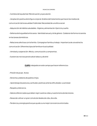 El documento presenta los objetivos fundamentales y temas de unas tutorías para estudiantes de 1o de ESO. Los objetivos incluyen desarrollar hábitos saludables, valorar la salud, rechazar comportamientos no saludables, comportarse de forma responsable, conocerse a sí mismo y desarrollar la autoestima. Los temas a tratar son anatomía sexual, cambios de la pubertad, hábitos saludables, igualdad de géneros, relaciones familiares y amistades, y sustancias nocivas. Se trabajarán clips relacion