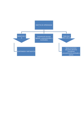 Este documento describe objetos de aprendizaje y su uso en la educación. Explica que los objetos de aprendizaje son recursos digitales autocontenibles y reutilizables que apoyan el proceso educativo al facilitar el dominio de conceptos, procedimientos, actitudes y valores. Además, proporciona una referencia bibliográfica del Ministerio de Educación Nacional de Colombia sobre objetos virtuales de aprendizaje.