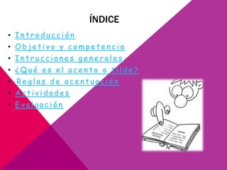 El documento proporciona una guía sobre las reglas de acentuación en español, incluyendo ejemplos de palabras agudas, graves, esdrújulas y sobresdrújulas. Se presentan conceptos teóricos junto con actividades para que los estudiantes practiquen y evalúen su comprensión del tema. Además, se incluyen referencias para ampliar el conocimiento sobre la ortografía y acentuación.