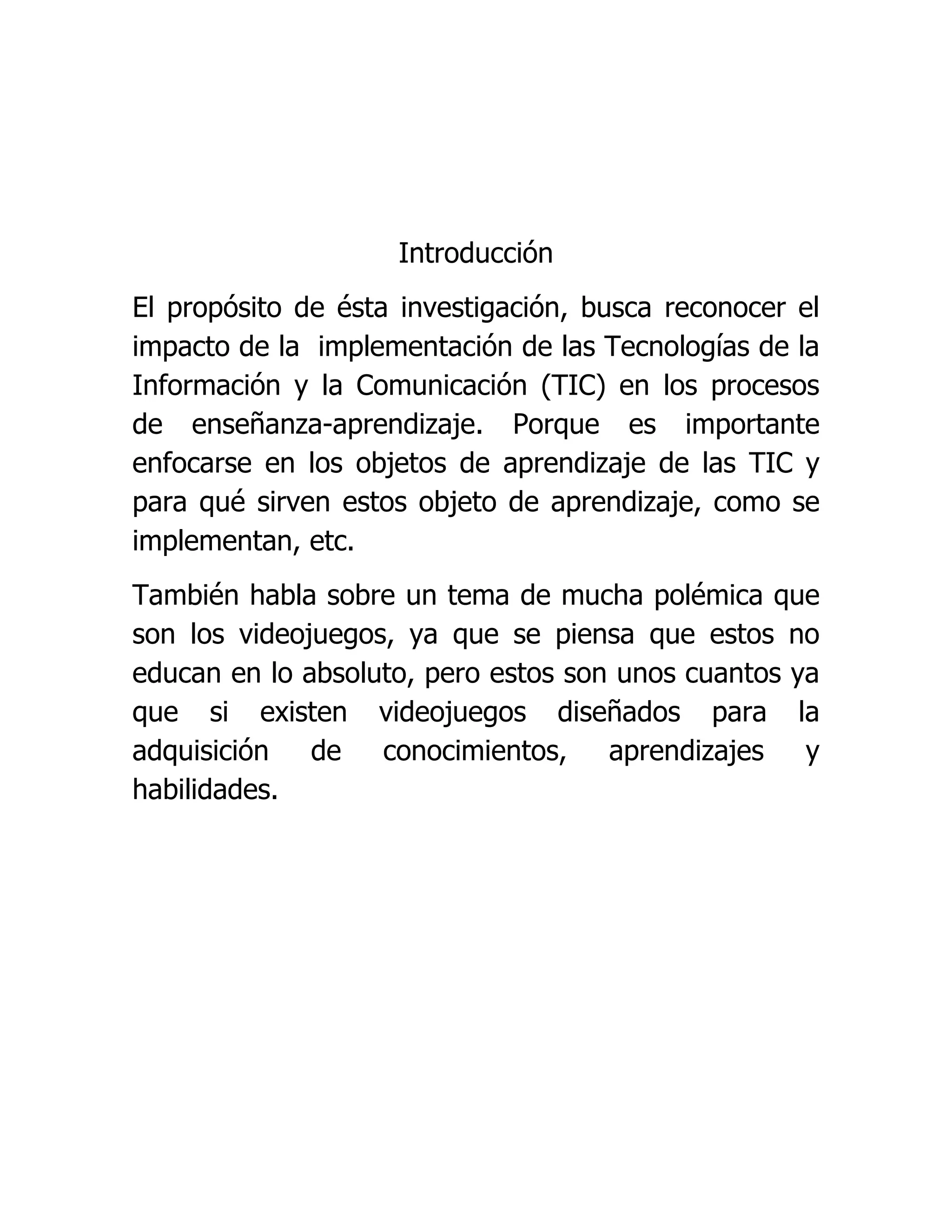 El documento discute el potencial educativo de las tecnologías de la información y la comunicación (TIC) y los videojuegos. Explica que los objetos de aprendizaje de las TIC pueden mejorar la educación al proporcionar ambientes virtuales y acceso remoto para el aprendizaje colaborativo. Además, algunos videojuegos pueden educar al desarrollar habilidades como la resolución de problemas y la toma de decisiones estratégicas, especialmente cuando simulan entornos del mundo real. El documento concluye
