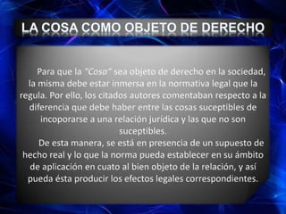 Este documento resume los diferentes tipos de bienes que pueden ser objeto de derecho según el Código Civil Venezolano, incluyendo bienes muebles e inmuebles, corporales e incorporales, fungibles e infungibles, consumibles e inconsumibles, divisibles e indivisibles, principales y accesorios, comerciales y fuera del comercio. Explica las definiciones y clasificaciones de cada tipo de bien establecidas en la ley.