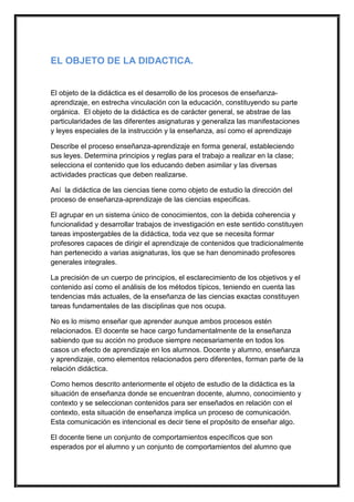 La didáctica tiene como objeto de estudio el proceso de enseñanza-aprendizaje, incluyendo la relación entre maestro y alumno, el contenido enseñado, y las estrategias y contexto educativo. Examina este proceso de forma general para establecer principios y métodos, considerando factores como las ciencias que se enseñan, los objetivos educativos, y tendencias actuales.