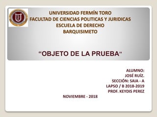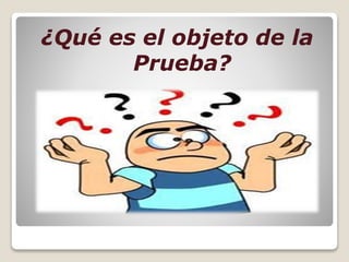 El documento define el objeto de la prueba como todo aquello sobre lo que puede recaer la veracidad o falsedad de un hecho, incluyendo hechos humanos, de la naturaleza, objetos materiales, la persona humana, y estados mentales. Explica que los hechos probables incluyen constitutivos, extintivos, impeditivos, modificativos, y aquellos que no requieren prueba como hechos notorios, comunicacionales, negativos, presumidos por la ley, y máximas de experiencia. Finalmente, indica