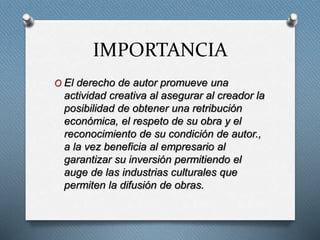 Este documento discute el objeto del derecho de autor. Explica que una obra protegida es la expresión personal de la inteligencia que desarrolla un pensamiento bajo una forma perceptible. La obra debe pertenecer al dominio literario, artístico o científico y tener originalidad. El derecho de autor promueve la actividad creativa al garantizar al creador una retribución económica por su obra.
