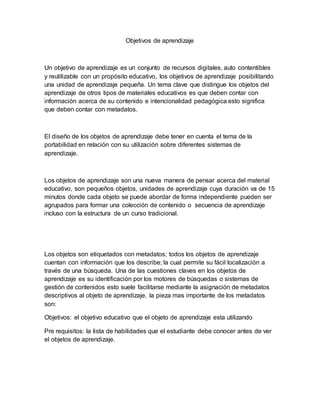 El documento describe los objetivos de aprendizaje como unidades pequeñas de aprendizaje autocontenidas y reutilizables con metadatos que describen su contenido y propósito pedagógico. Explica que los objetos de aprendizaje son pequeñas unidades de 15 minutos que pueden agruparse para formar colecciones o cursos y deben etiquetarse con metadatos como objetivos, prerequisitos y tema para facilitar su búsqueda. Además, los objetos de aprendizaje deben diseñarse para ser portables entre diferentes sistemas de aprend
