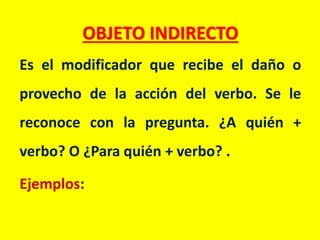 El objeto indirecto es el modificador que recibe el daño o beneficio de la acción del verbo y se identifica con las preguntas "¿A quién?" o "¿Para quién?". Los ejemplos incluyen "Juanito invita gaseosa a sus amigos" y "El colegio organizó un concurso para los alumnos".