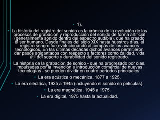 El documento resume la historia de la grabación y reproducción del sonido desde 1877 hasta la actualidad, dividiéndola en cuatro períodos principales: acústico, eléctrico, magnético y digital. También describe tres métodos comunes de fabricación de equipos de sonido: punto a punto, turret board y ojalillos. Finalmente, enumera los materiales necesarios para un equipo de sonido básico y analiza los impactos del ruido ambiental en la salud humana.