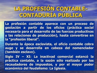 El documento describe la evolución de la profesión contable desde sus orígenes como oficio hasta convertirse en una profesión formal. Explica que la contabilidad ha sido tradicionalmente empírica pero que existen esfuerzos para desarrollarla como una ciencia social rigurosa mediante la identificación de su objeto de estudio (la actividad económico-social) y el uso de métodos científicos como la inducción, deducción y análisis histórico. El autor argumenta que definir claramente el objeto y método permitiría que